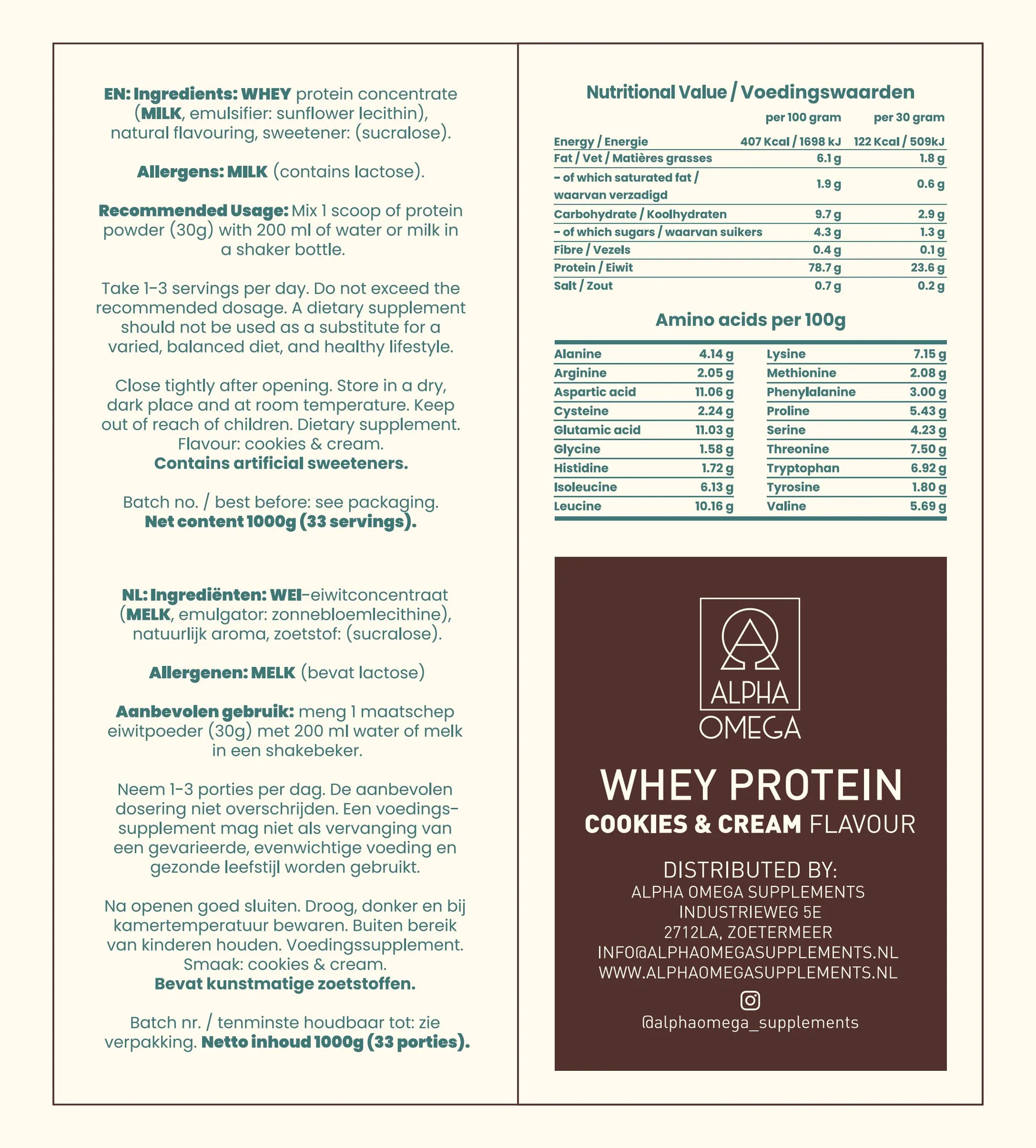 Voor de echte zoetekauw! Onze cookies & cream whey proteïne heeft een rijke, romige smaak die doet denken aan je favoriete koekjesdessert. Perfect voor eiwitshakes, baksels en heerlijk met melk of havermout.